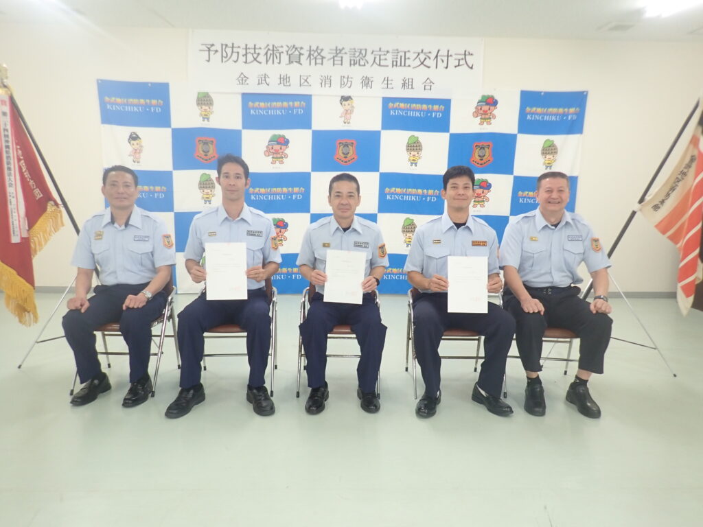 この資格は、予防業務の充実強化を目指すもので、種類として防火査察・消防用設備等・危険物があり取得数に応じて3種類のワッペンの色(金・銀・銅)があります。今回、金武地区消防本部では、銀2名、銅1名を山内消防長より一人ひとりに認定証と資格者ワッペンが授与されました。